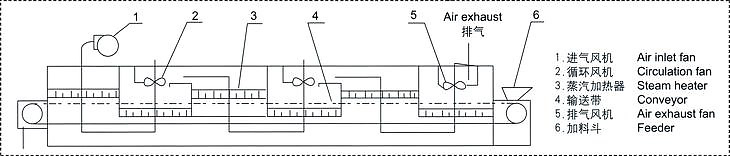 DW系列帶式干燥機(jī)料斗中的物料由加料器均勻地鋪在網(wǎng)帶上,網(wǎng)帶采用12-60目不銹鋼絲網(wǎng),由傳動裝置拖動在干燥機(jī)內(nèi)移動。干燥段由若干單元組成,每一單元熱風(fēng)獨(dú)立循環(huán),其中部分尾氣由專門排濕風(fēng)機(jī)排出,每一單元排出氣量均有調(diào)節(jié)閥控制。在上循環(huán)單元中,循環(huán)風(fēng)機(jī)出來的風(fēng)由側(cè)面風(fēng)道進(jìn)入單元下腔,氣流向上通過換熱器加熱,并經(jīng)分配器分配后。成噴射流吹向網(wǎng)帶,穿過物料后進(jìn)入上腔。干燥過程是熱風(fēng)氣流穿過物料層,完成熱量與質(zhì)量傳達(dá)過程。上腔由風(fēng)管與風(fēng)機(jī)入口相連,大部分氣流體循環(huán),一部分溫度較低含濕量較大的氣體作為廢氣經(jīng)排濕管、調(diào)節(jié)閥、跳濕風(fēng)機(jī)排出。下循環(huán)單元中,循環(huán)風(fēng)機(jī)出來的風(fēng)先進(jìn)入上腔,向下經(jīng)換熱器加熱,穿過物料層進(jìn)入下腔,下腔由側(cè)面風(fēng)道及回風(fēng)管與風(fēng)機(jī)入口相連,大部分氣體循環(huán),一部分排出。上下循環(huán)單元根據(jù)用戶需要可靈活配備,單元數(shù)量亦可根據(jù)需要選取。