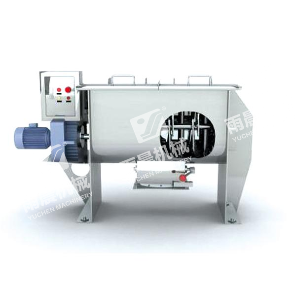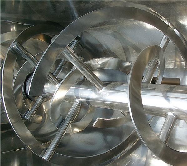 該機(jī)由混合槽、螺旋攪拌葉片和傳動(dòng)部件等組合合成,螺旋葉片一般做成二層,外層螺旋將物料從兩側(cè)向中央?yún)R集,內(nèi)層螺旋將物料從中央向兩側(cè)分流,使物料在混合槽內(nèi)形成對(duì)流混合,從而達(dá)到高均勻度混合。